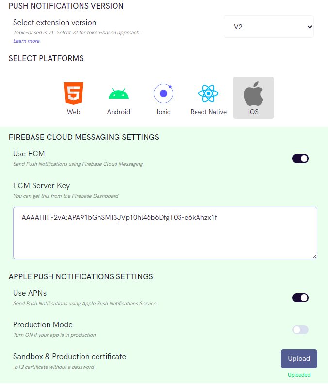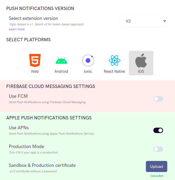1. The extension version has to be set to ‘V2’ or ‘V1 & V2’ in order to use APNs as the provider.