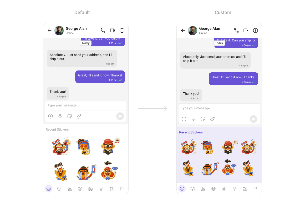 The CometChatStickerKeyboard simplifies the integration of sticker-based messaging. Customize the background, grid layout, and sticker display styles to align with your chat experience. This component provides a visually rich and interactive way to enhance conversations.