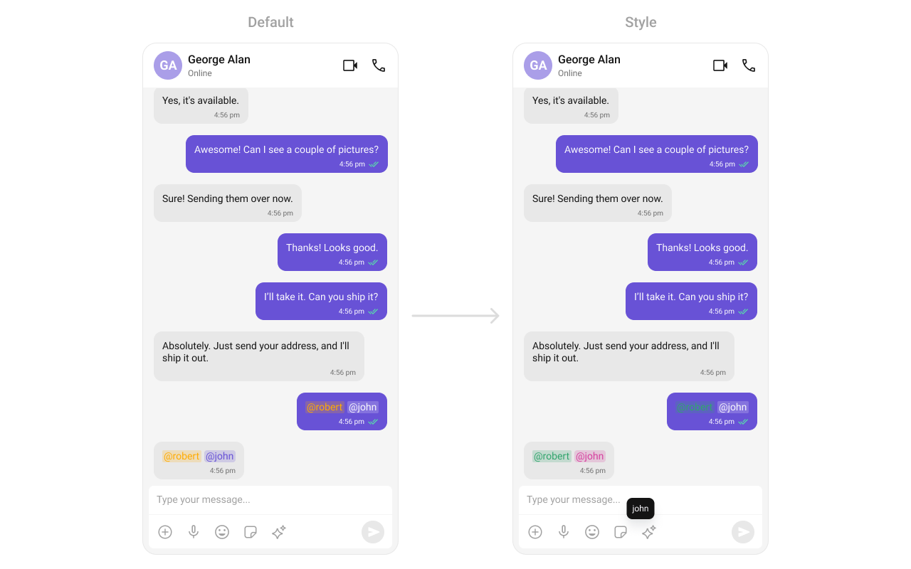 For advanced-level customization, you can set the style of the Mentions formatters. This lets you tailor each aspect of the component to fit your exact needs and application aesthetics. You can create and define your formatters style.