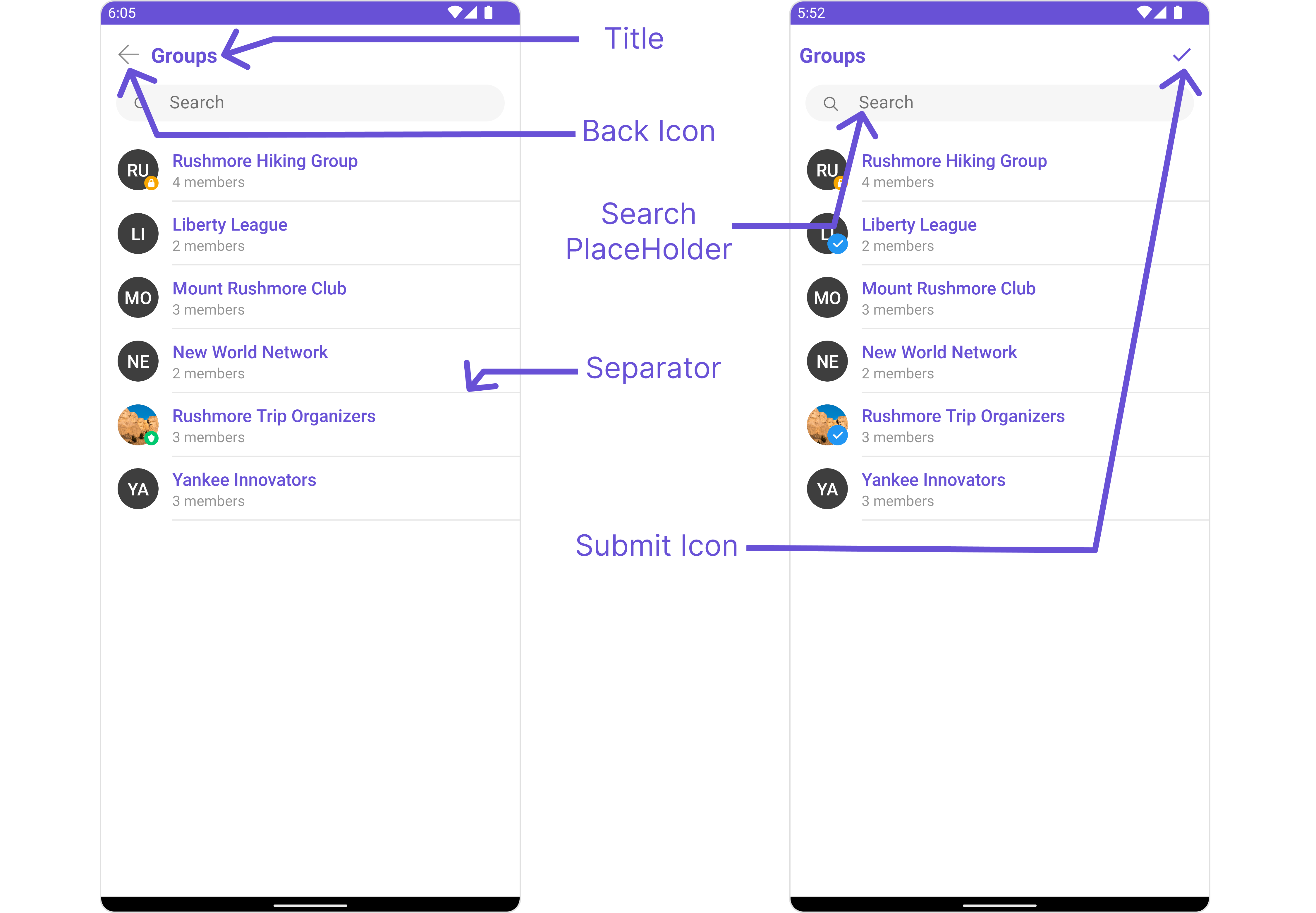 | SeparatorColor | Used to set the color of the divider separating the group member items | setSeparatorColor(@ColorInt int) |