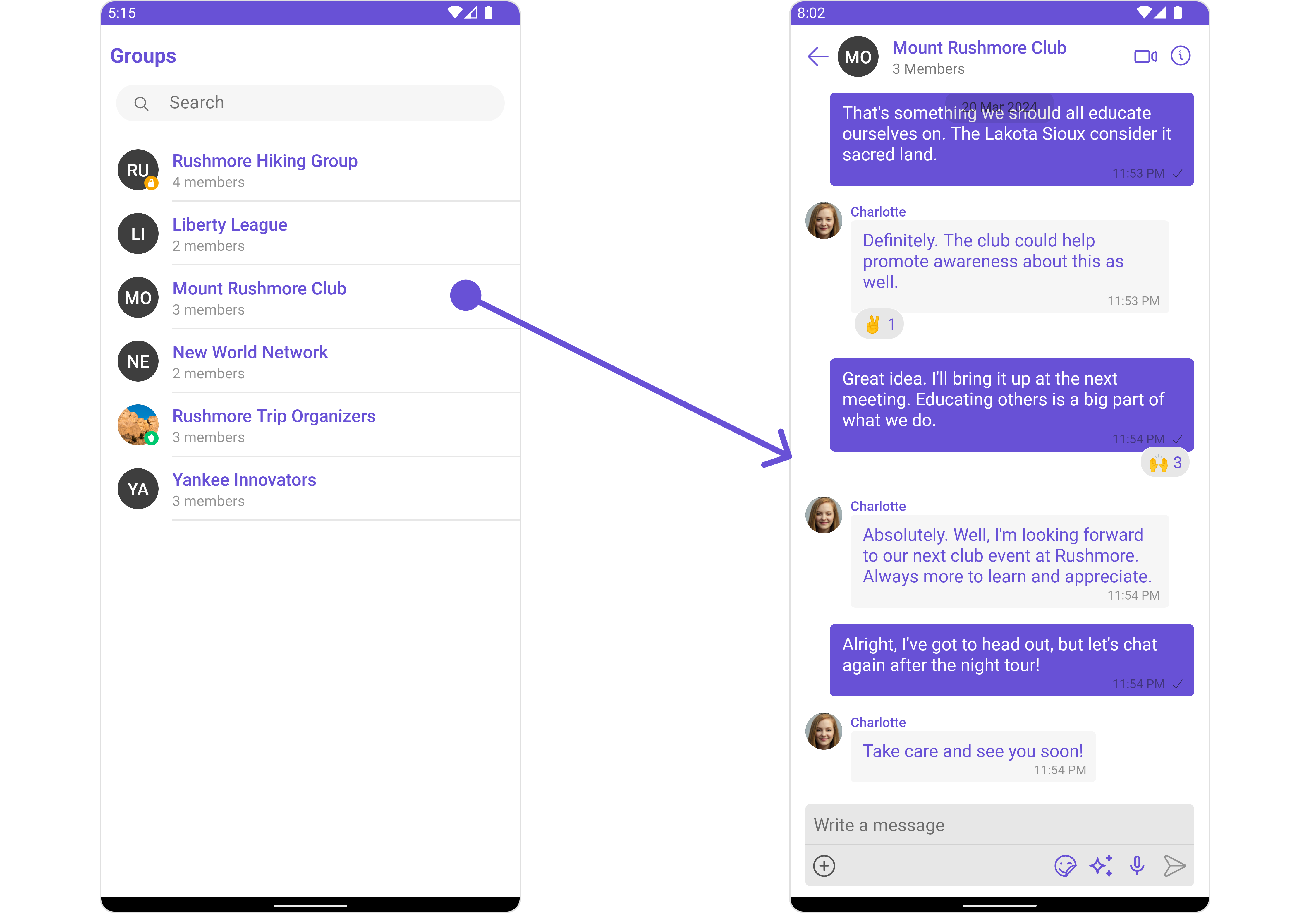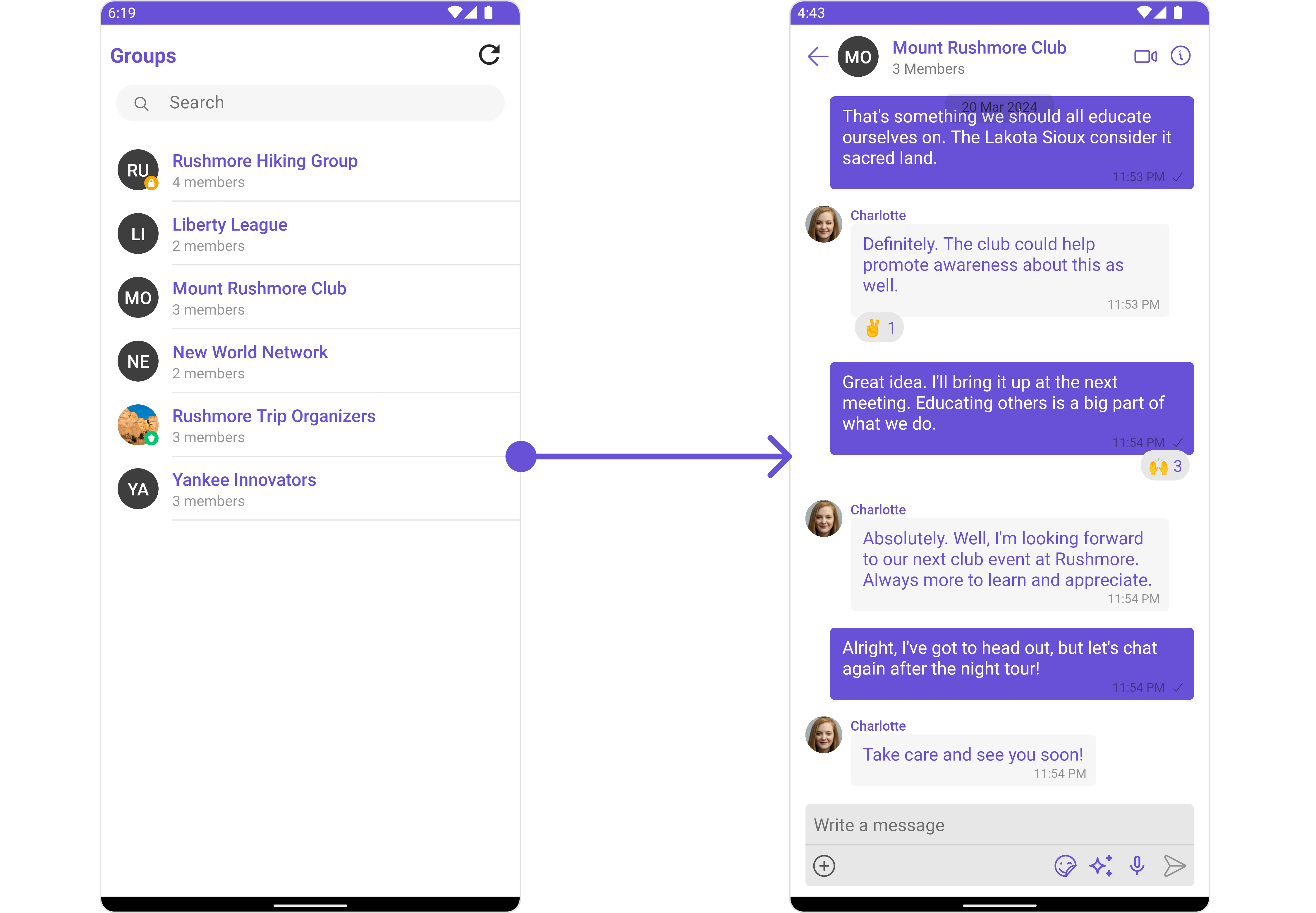 Using Style you can customize the look and feel of the component in your app, These parameters typically control elements such as the color, size, shape, and fonts used within the component. You can also customize its component styles. For more details on individual component styles, you can refer Groups Styles and Messages Styles. Styles can be applied to SubComponents using their respective configurations. Example Here we are changing the style of Groups and Messages component using GroupsConfiguration and MessageConfiguration- Java