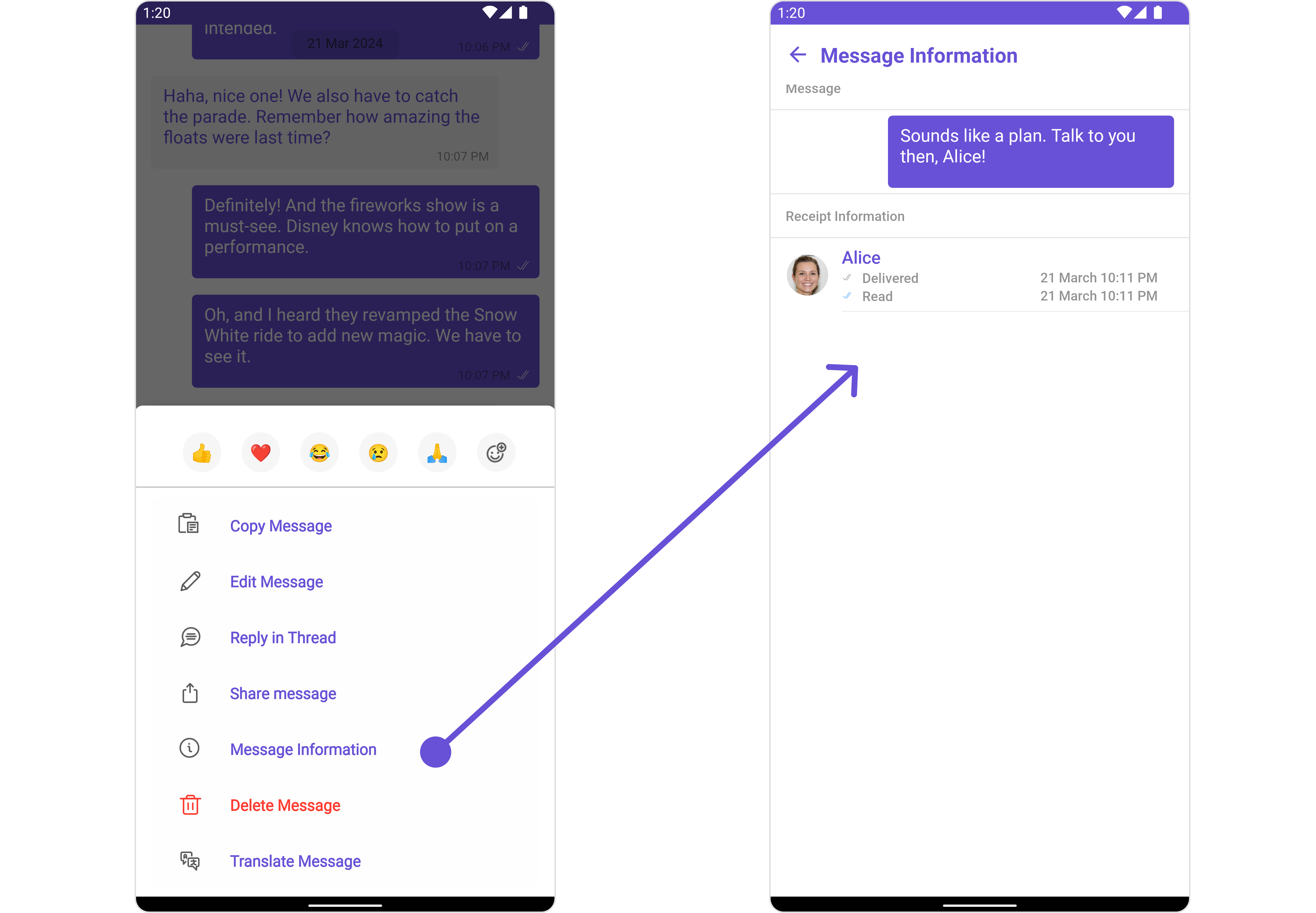 | Hide Receipt | Used to control visibility of read receipts without disabling the functionality of marking messages as read and delivered. | .hideReceipt(false); |
