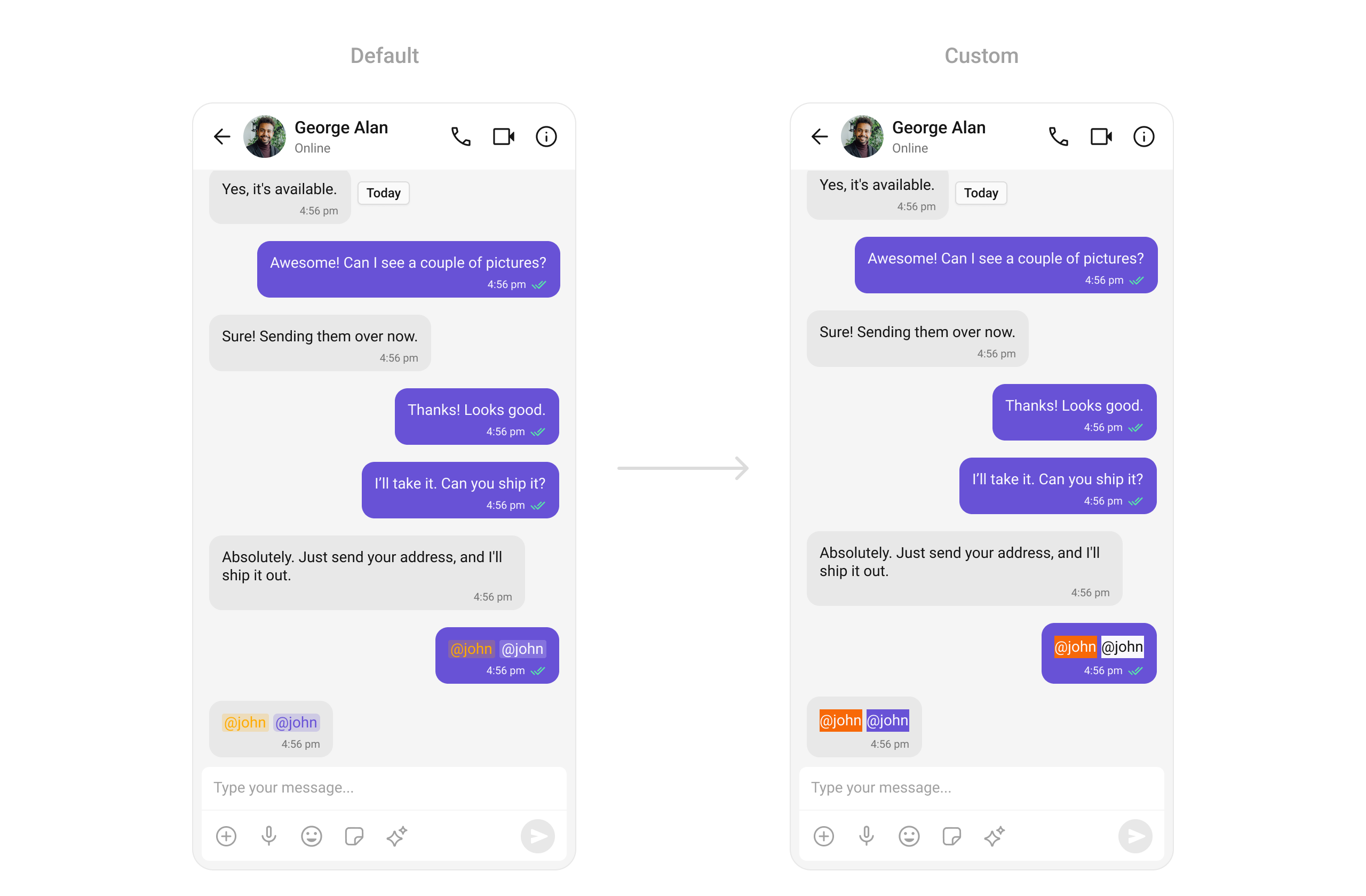 Customize the appearance of message lists, including bubble styles, timestamps, and reactions.