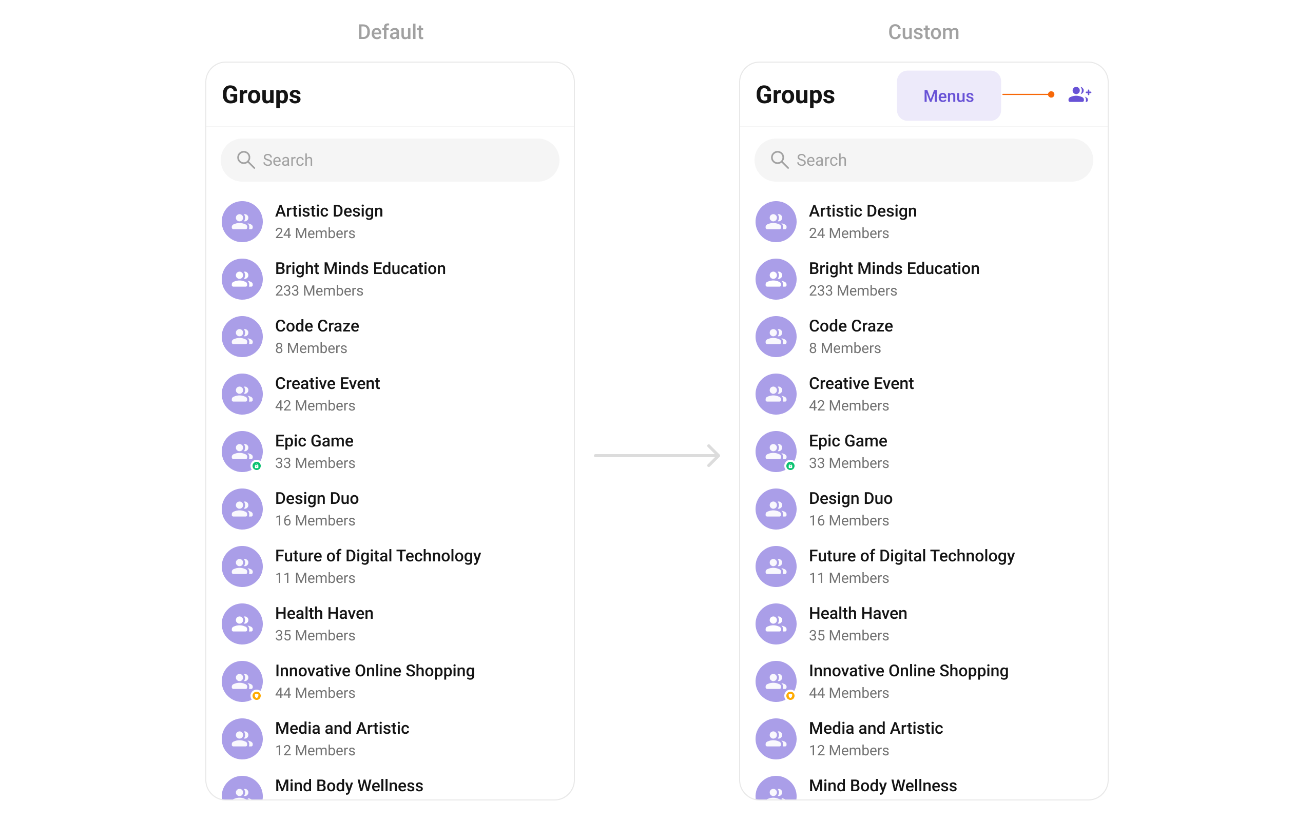 The GroupsRequestBuilder enables you to filter and customize the group list based on available parameters in GroupsRequestBuilder. This feature allows you to create more specific and targeted queries when fetching groups. The following are the parameters available in GroupsRequestBuilder
