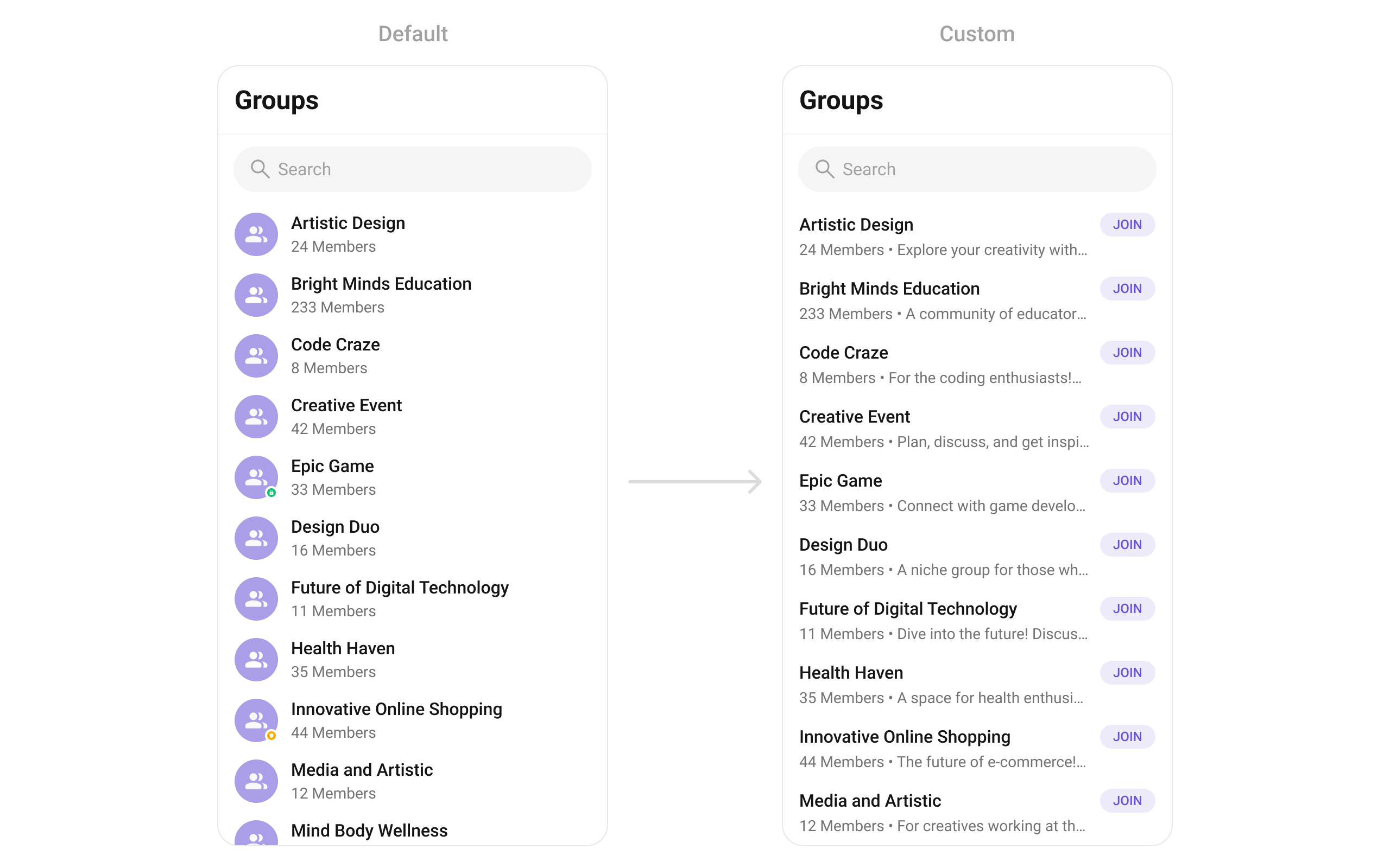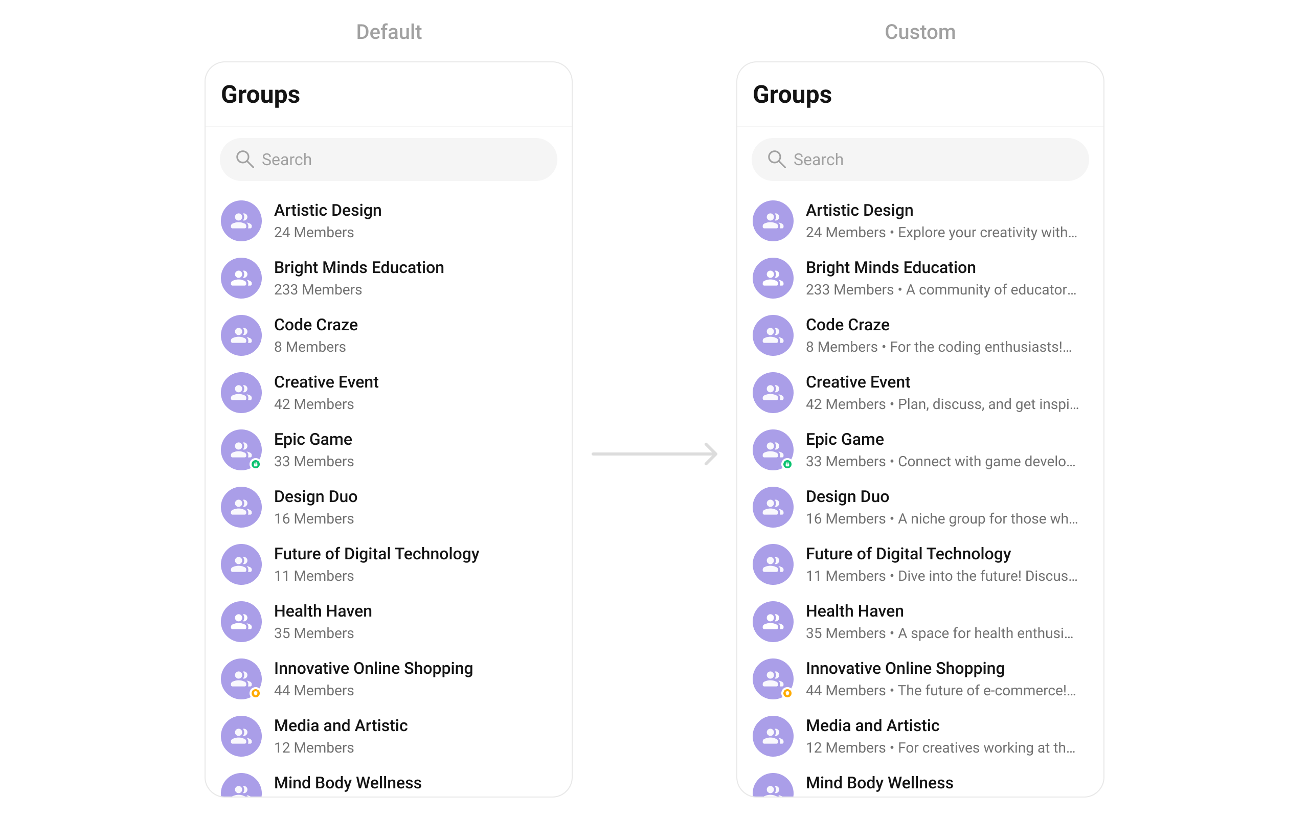 CometChatListItemThis widget renders information extracted from a Group object onto a tile, featuring a title, subtitle, leading view, and trailing view.