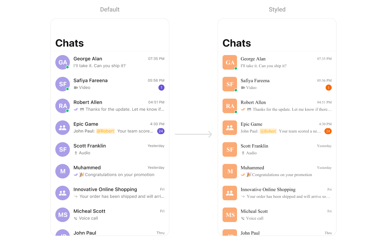 CometChat UIKit for iOS enables developers to integrate customizable components into their applications effortlessly. Each component is designed to ensure a consistent user experience, offering flexibility to align with your app’s design system. You can modify attributes such as colors, fonts, sizes, and more using CometChatTheme or directly applying styles to components. Below is a detailed guide for styling individual components within the UIKit.Components