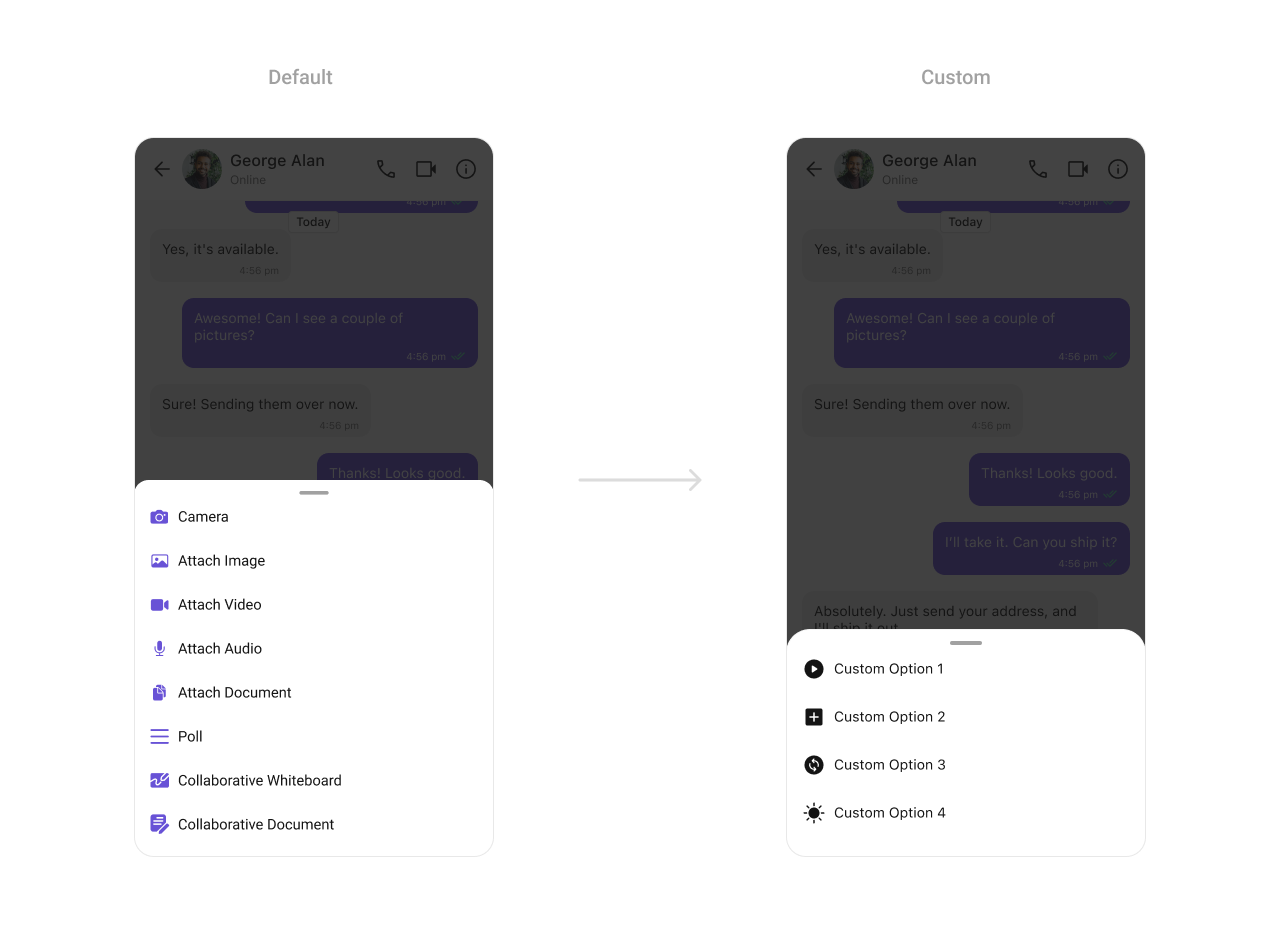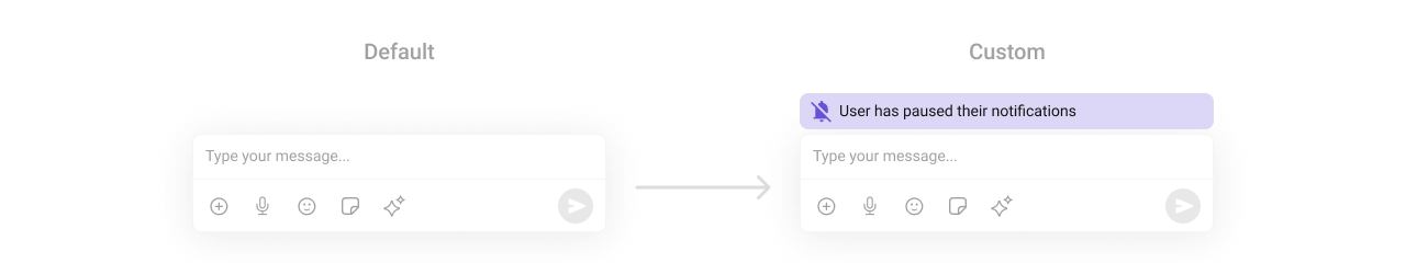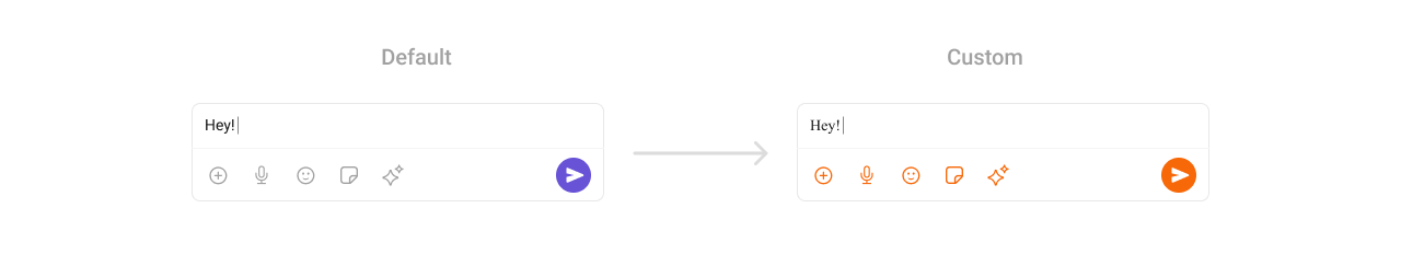 To fit your app’s design requirements, you can customize the appearance of the MessageComposer component. We provide exposed methods that allow you to modify the experience and behavior according to your specific needs.
