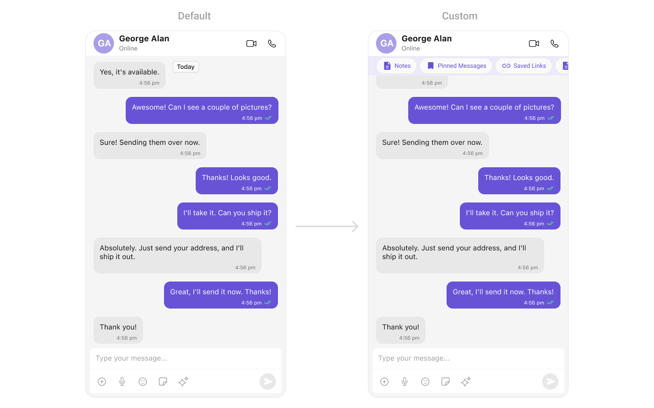 To fit your app’s design requirements, you can customize the appearance of the conversation component. We provide exposed methods that allow you to modify the experience and behavior according to your specific needs.Style