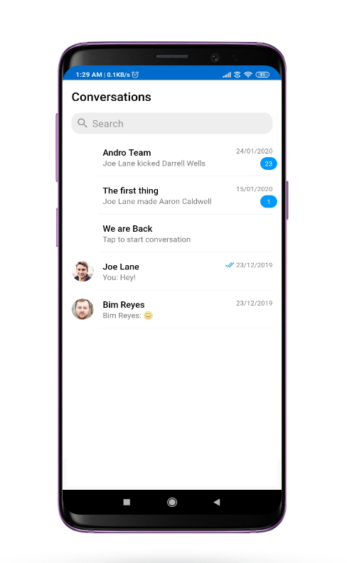 CometChatConversations is a custom RecyclerView which will help you to display a list of all the users and groups in which the logged-in user has made any conversation.