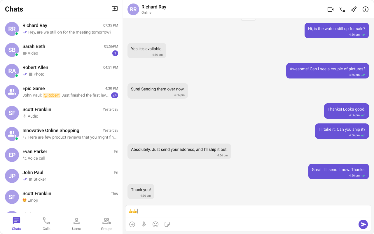 Best for: Applications that need a two-panel layout, such as web-based chat interfaces (e.g., WhatsApp Web, Slack). Features:- Two-panel layout – Displays the conversation list on the left and the active chat window on the right.